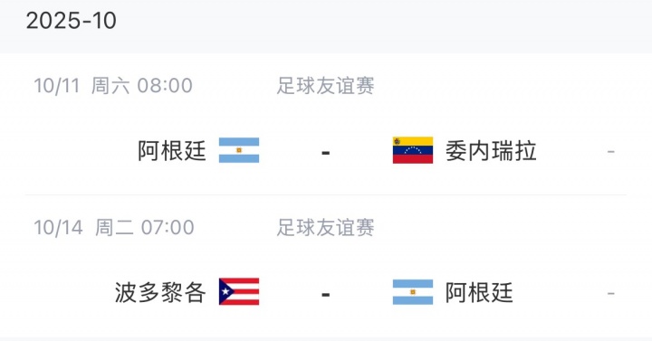阿根廷将在10月进行两场友谊赛,分别是11日对阵委内瑞拉和14日对阵波多黎各。
